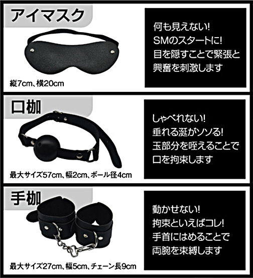 ◆商品仕様:パッケージ:16.0×6.5×6.5cm 本体:アイマスク(フリーサイズ:縦7.0×横20.0cm)、口枷(最大57.0cm・幅2.0cm・ボール径4.0cm)、手枷(最大サイズ27.0cm・幅5.0cm・チェーン9.0cm)、乳首クリップ(最大開口幅2.0cm・鈴径1.0cm)、バラムチ(全長40.0cm※ストラップ含まず) 重量:210g
